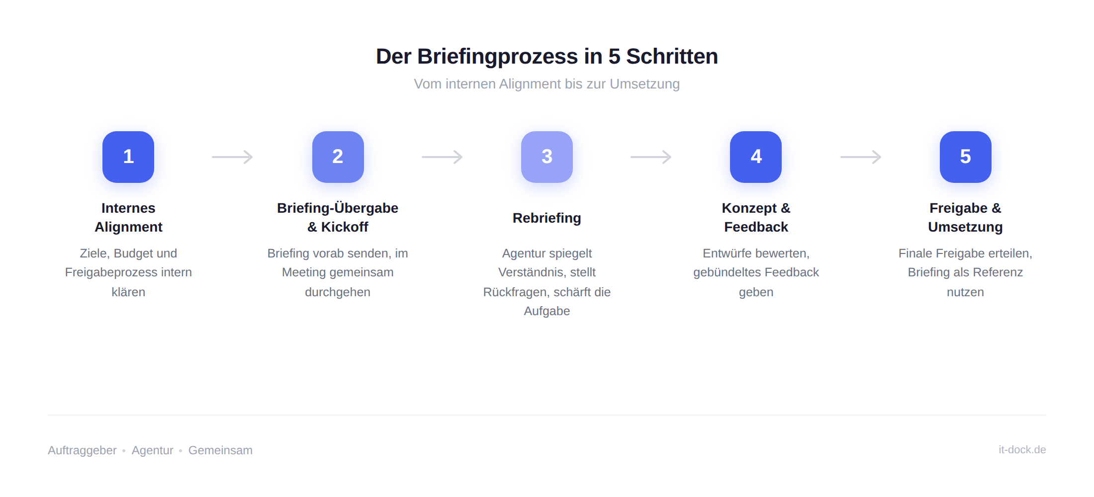 Ein gutes Briefing ist ein Dokument. Ein guter Briefingprozess ist die Art, wie dieses Dokument entsteht, übergeben und weiterverarbeitet wird. Der Prozess umfasst fünf Schritte: